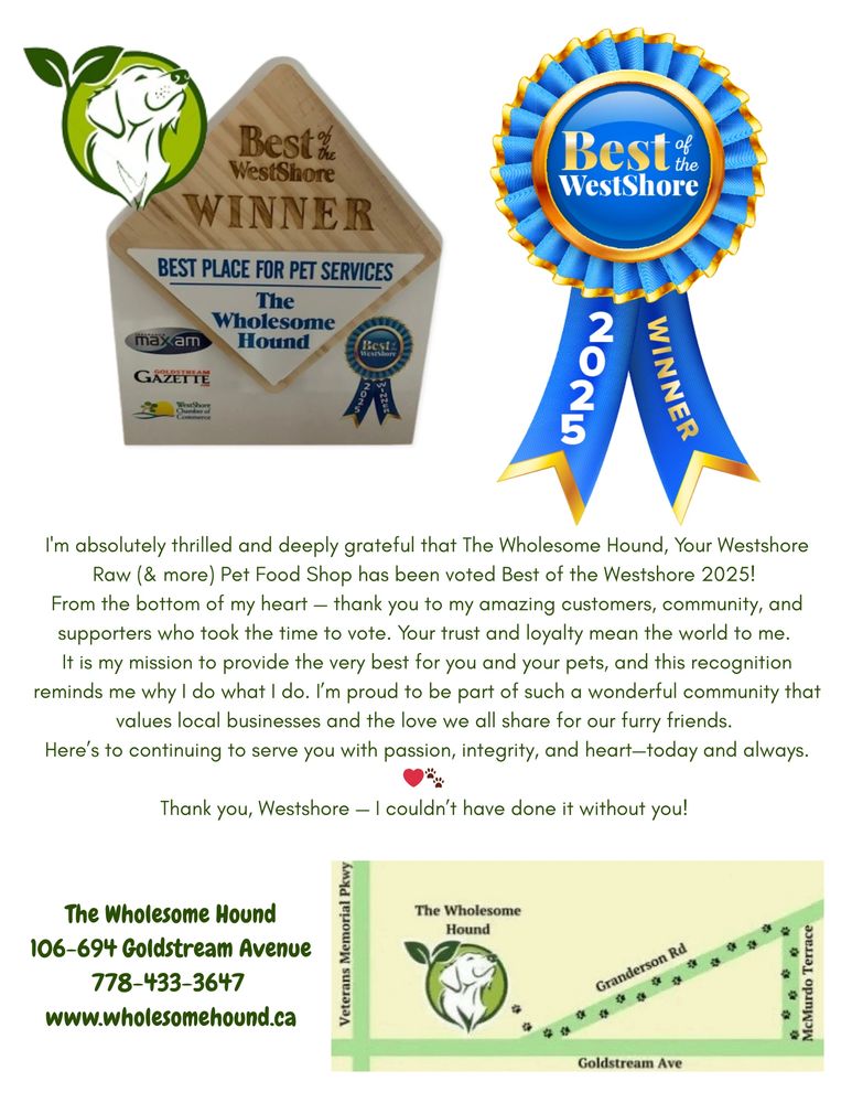 At The Wholesome Hound, we're more than just a pet store; we're your friendly, woman-run, locally owned and operated neighbourhood hub. We're proud to call the Westshore our home, where we live, work, and play alongside our canine companions.